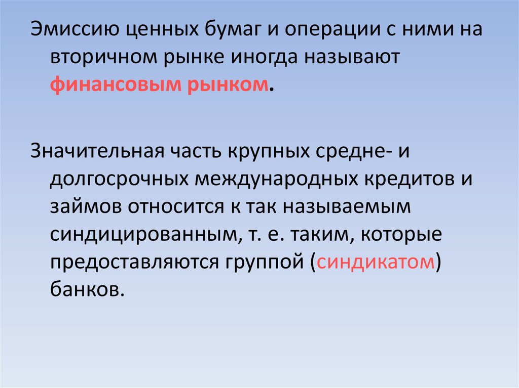 Эмиссию ценных бумаг и операции с ними навторичном рынке иногда называют
