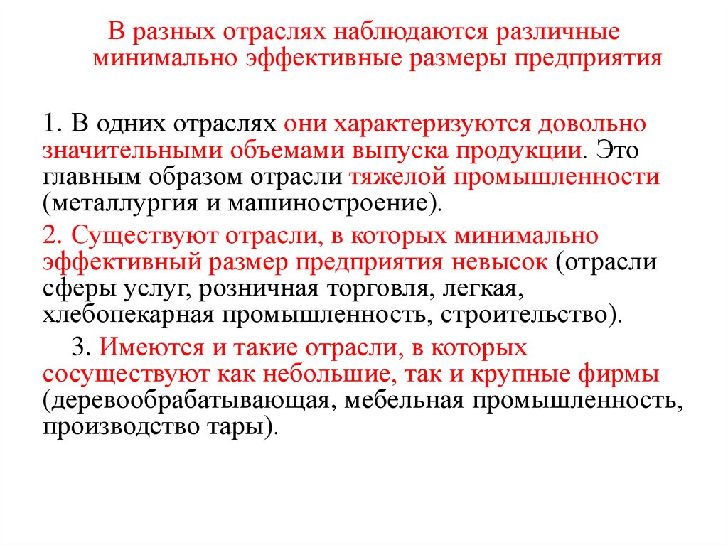эффективный размер предприятия невысок (отрасли
