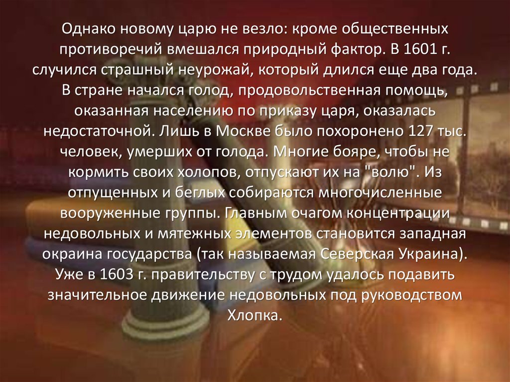 Однако новому царю не везло: кроме общественныхпротиворечий вмешался природный фактор. В 1601 г.