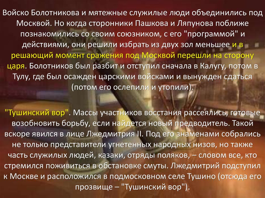Войско Болотникова и мятежные служилые люди объединились подМосквой. Но когда сторонники Пашкова и Ляпунова поближе