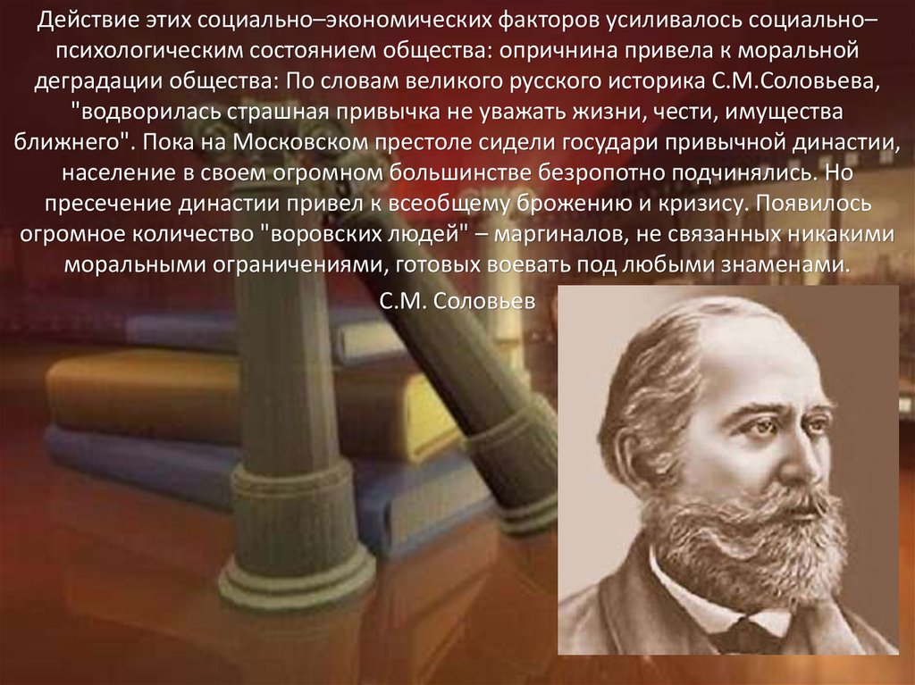 Действие этих социально–экономических факторов усиливалось социально–психологическим состоянием общества: опричнина привела к моральной