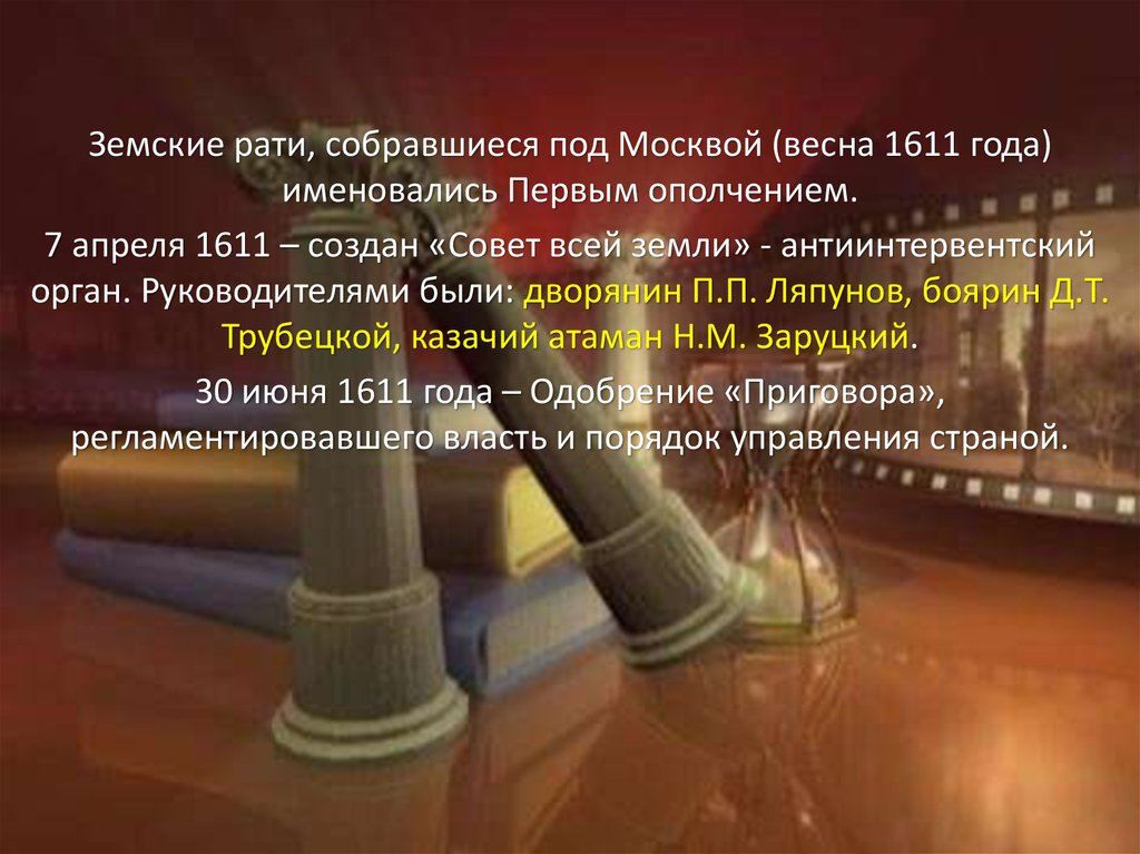 орган. Руководителями были: дворянин П.П. Ляпунов, боярин Д.Т.