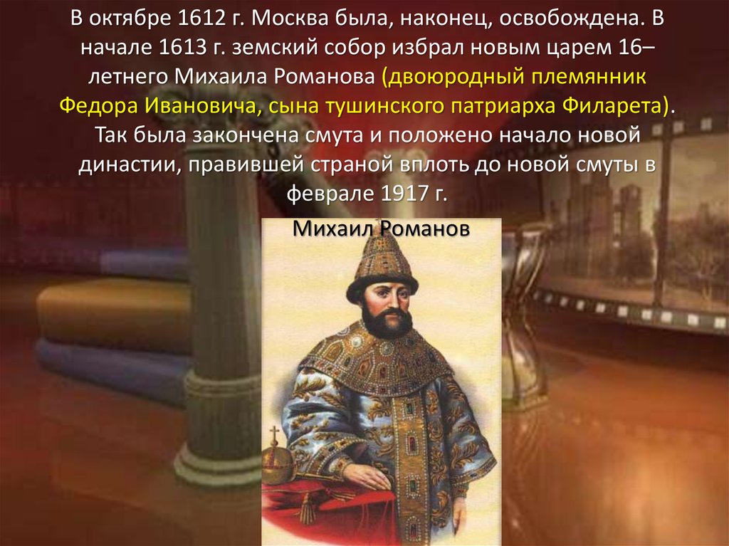 В октябре 1612 г. Москва была, наконец, освобождена. Вначале 1613 г. земский собор избрал новым царем 16–