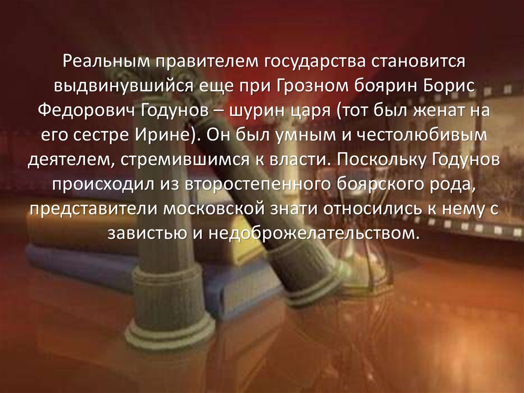 Реальным правителем государства становитсявыдвинувшийся еще при Грозном боярин Борис