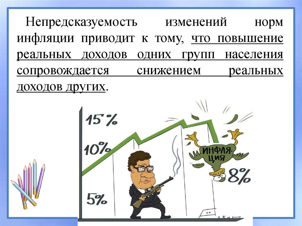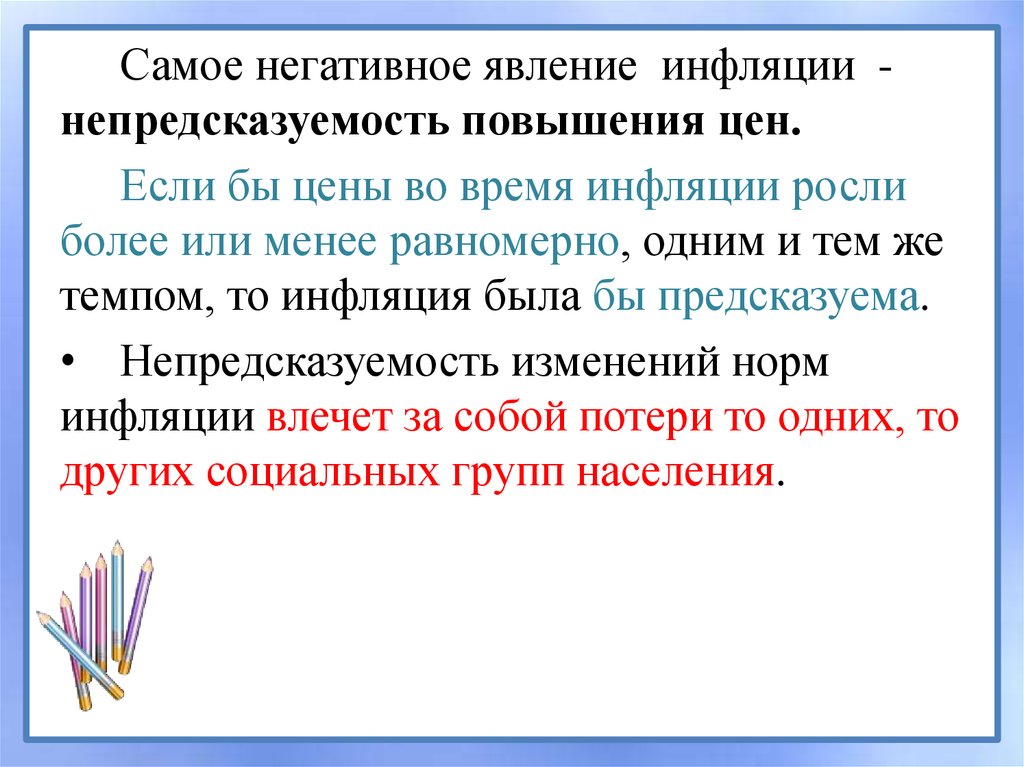 Самое негативное явление инфляции непредсказуемость повышения цен.Если бы цены во время инфляции росли