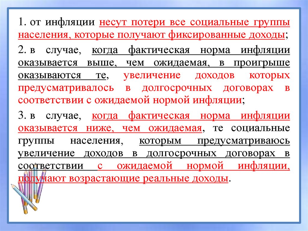 1. от инфляции несут потери все социальные группынаселения, которые получают фиксированные доходы;