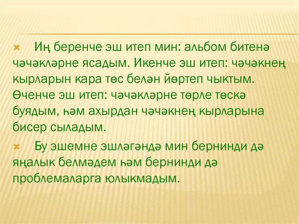 Иң беренче эш итеп мин: альбом битенәчәчәкләрне ясадым. Икенче эш итеп: чәчәкнең