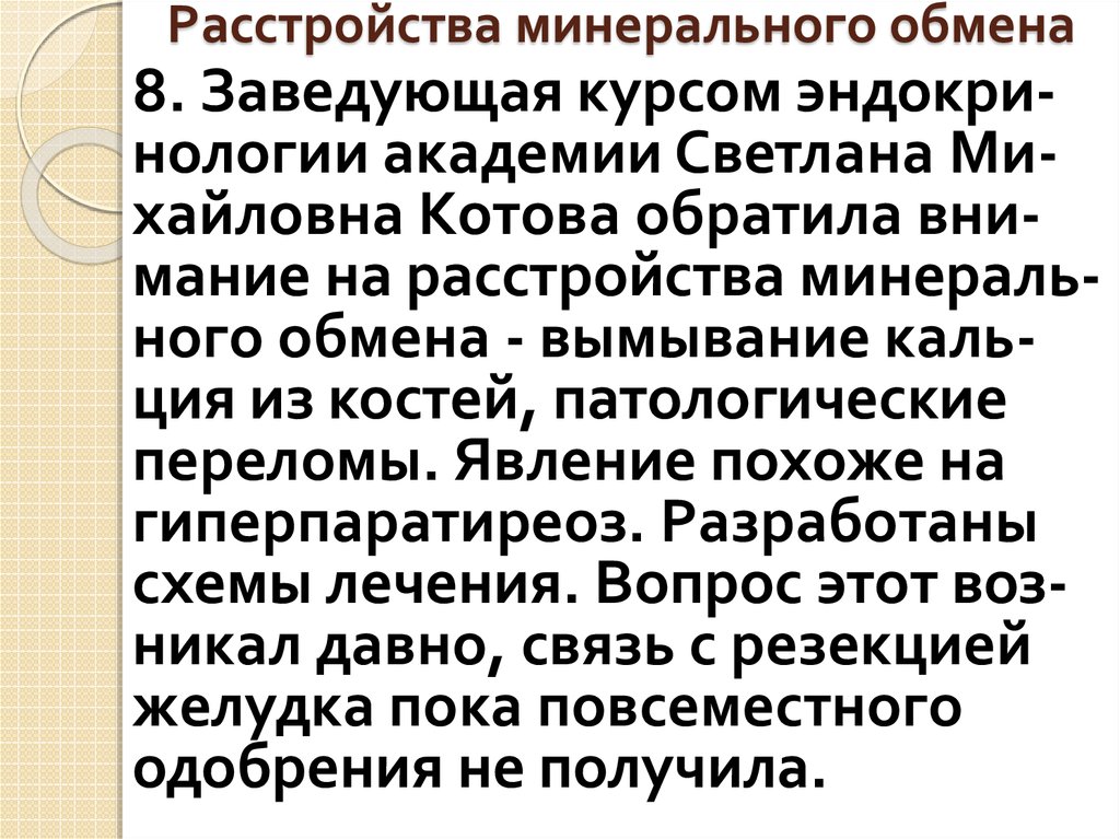 Расстройства минерального обмена8. Заведующая курсом эндокринологии академии Светлана Михайловна Котова обратила внимание на расстройства минерального обмена - вымывание кальция из костей, патологические
