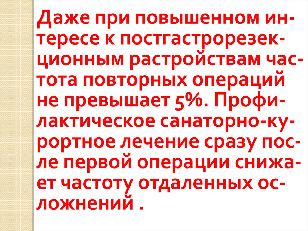 Даже при повышенном интересе к постгастрорезекционным растройствам частота повторных операцийне превышает 5%. Профилактическое санаторно-курортное лечение сразу после первой операции снижает частоту отдаленных осложнений .