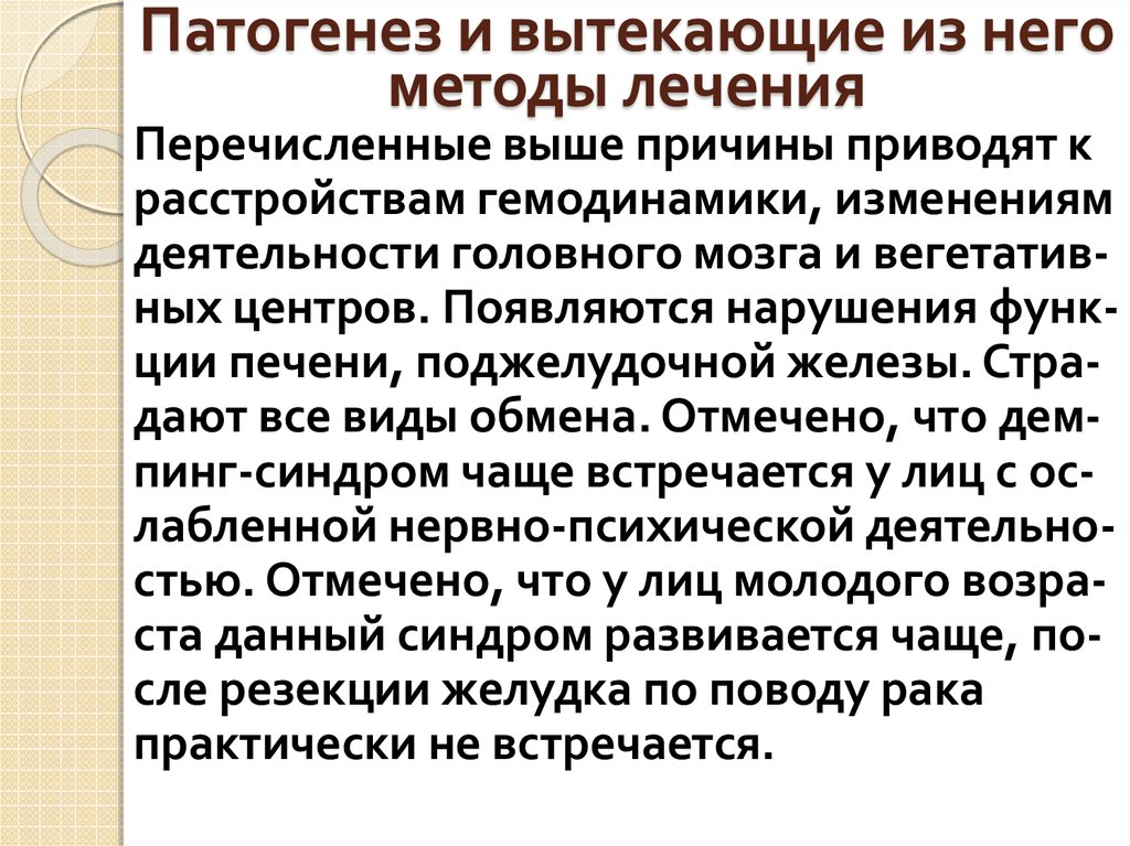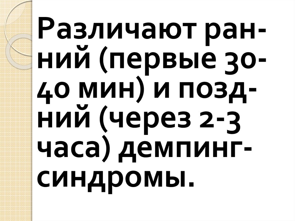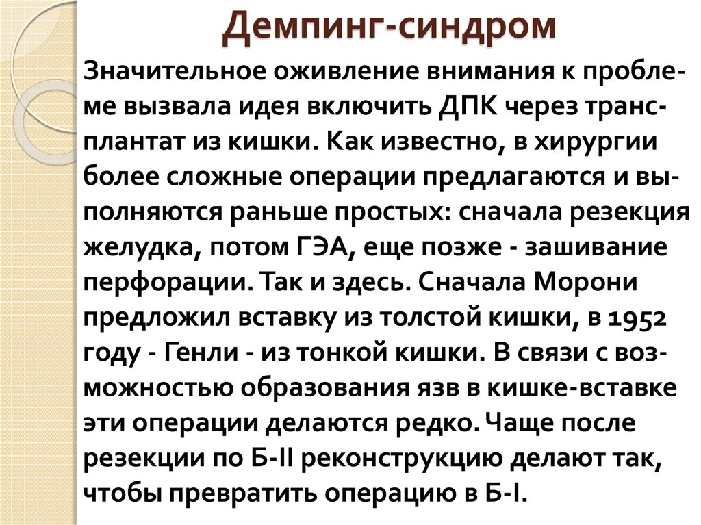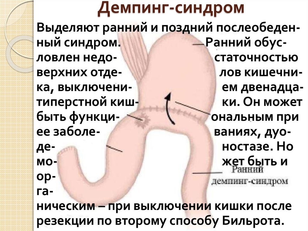 3. Может быть функциональным и органическим. Оперативное лечение применяетсятолько при выраженной степени. Необходимы доказательства - рентгеновские и гастроскопические. При нерезко выраженном демпинг-синдроме и