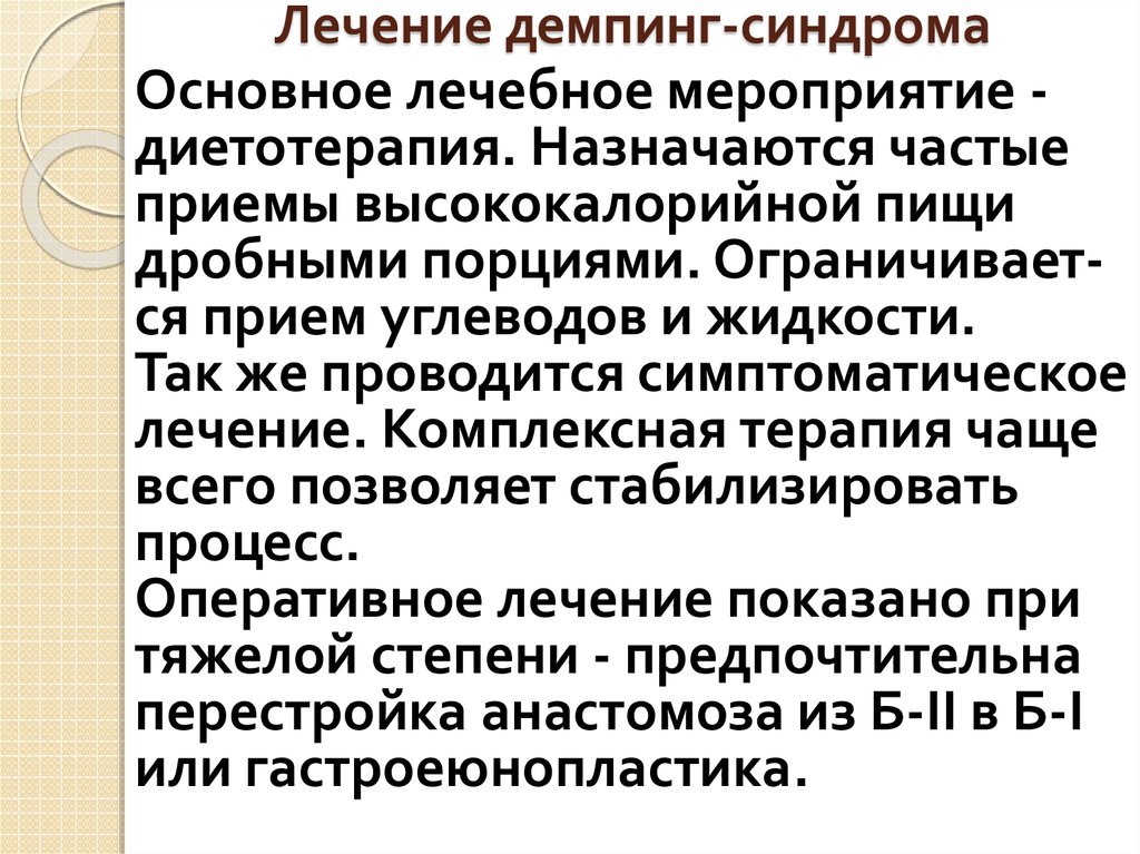 Лечение демпинг-синдромаОсновное лечебное мероприятие диетотерапия. Назначаются частые