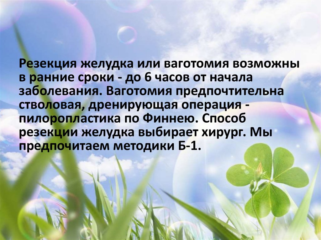 Резекция желудка или ваготомия возможныв ранние сроки - до 6 часов от начала