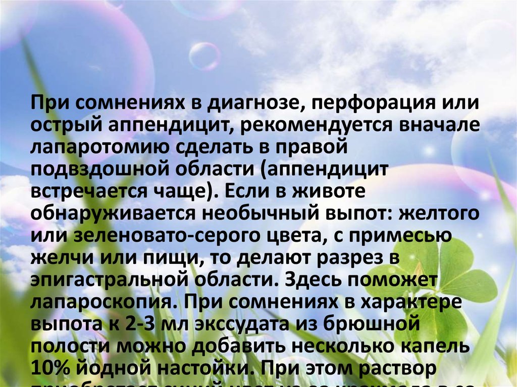 момента перфорации в брюшной полости имеется прозрачный экссудат.