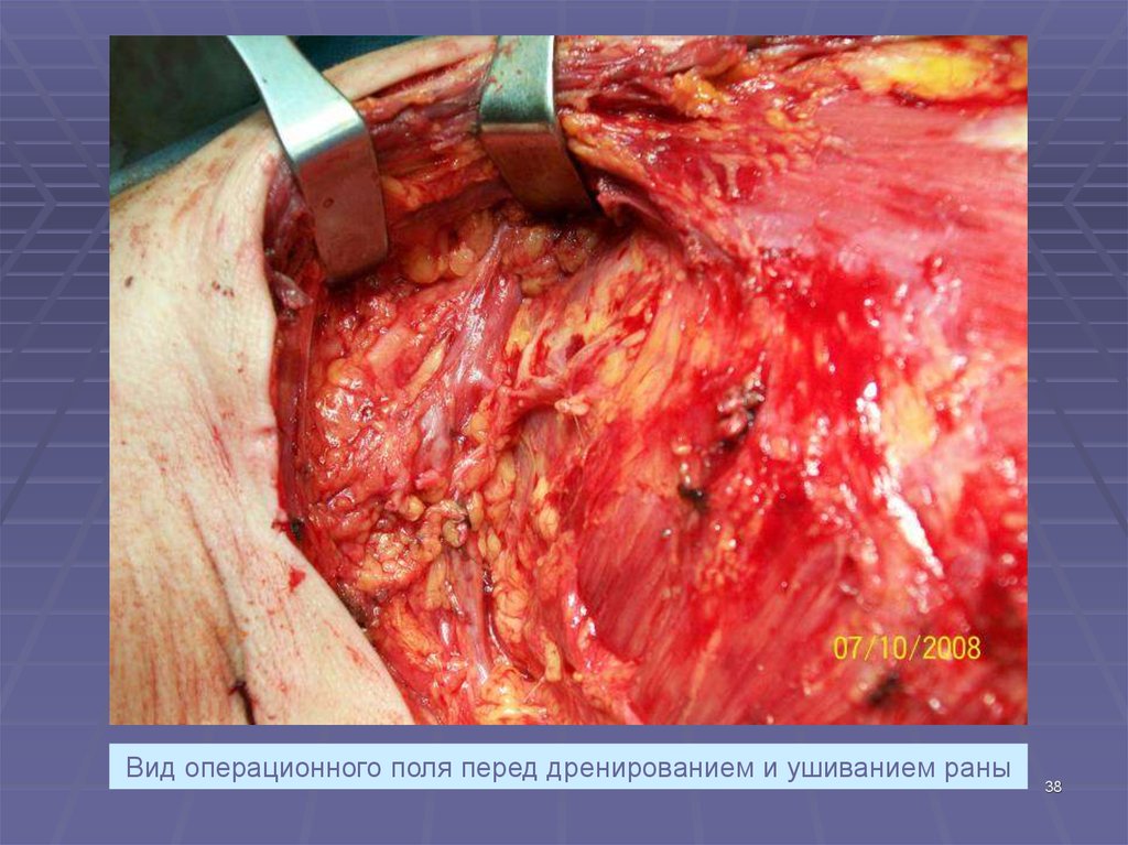 Вид операционного поля перед дренированием и ушиванием раны38