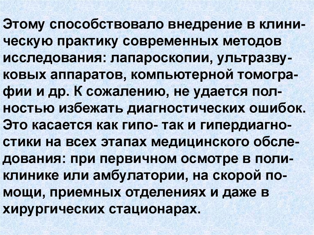 Этому способствовало внедрение в клиническую практику современных методовисследования: лапароскопии, ультразвуковых аппаратов, компьютерной томографии и др. К сожалению, не удается полностью избежать диагностических ошибок.