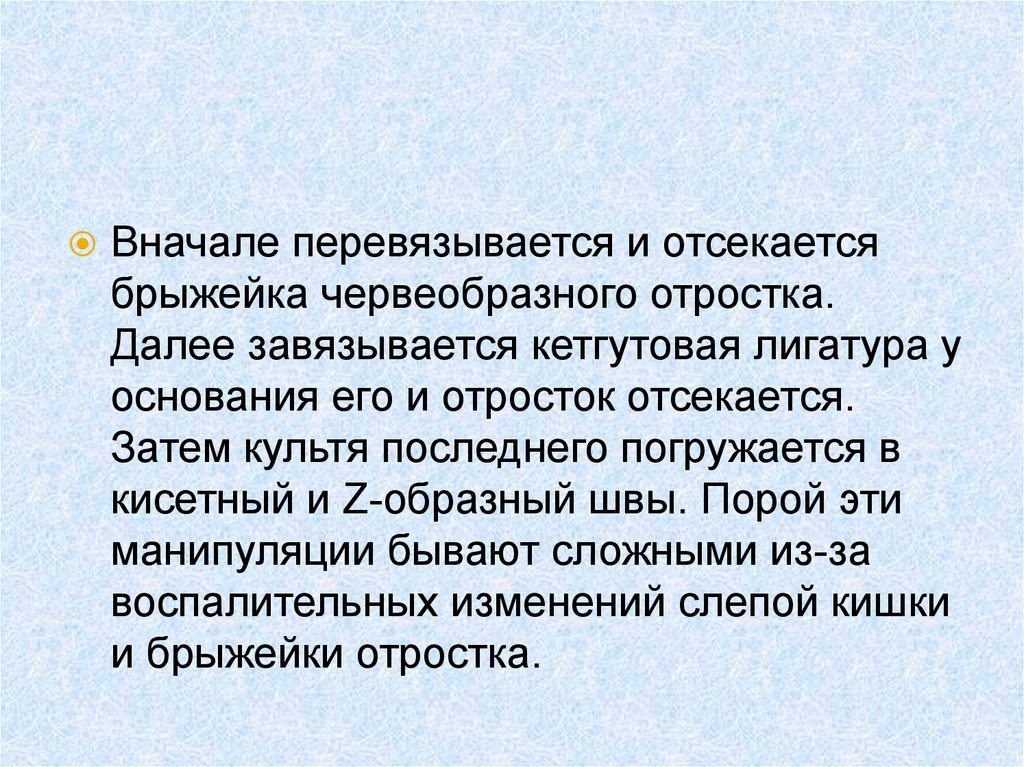 Вначале перевязывается и отсекаетсябрыжейка червеобразного отростка.