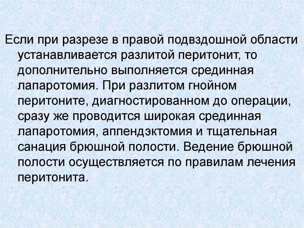 Если при разрезе в правой подвздошной областиустанавливается разлитой перитонит, то