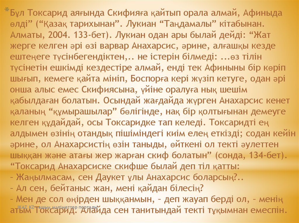 * Бұл Токсарид аяғында Скифияға қайтып орала алмай, Афиныдаөлді” (“Қазақ тарихынан”. Лукиан “Таңдамалы” кітабынан.