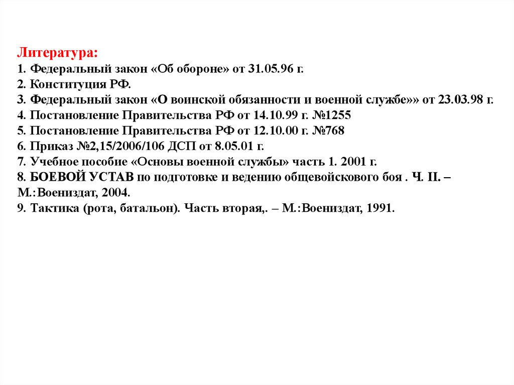 Литература:1. Федеральный закон «Об обороне» от 31.05.96 г.