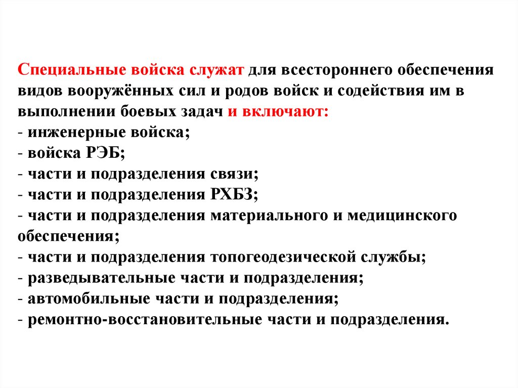 Специальные войска служат для всестороннего обеспечениявидов вооружённых сил и родов войск и содействия им в