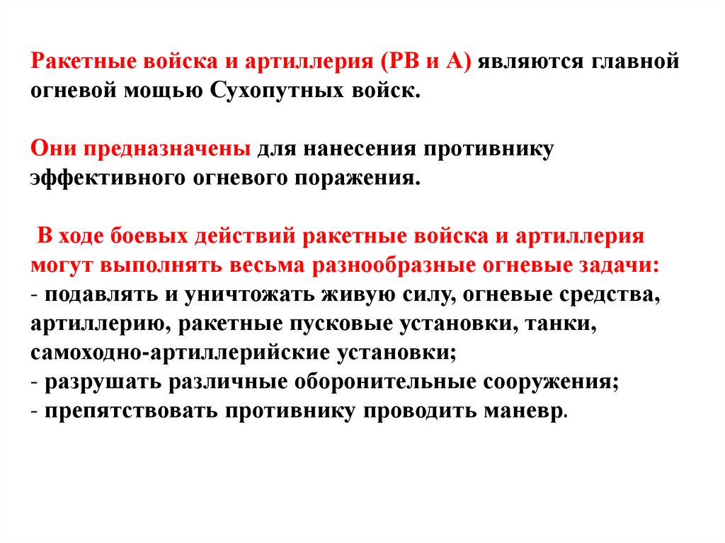 Ракетные войска и артиллерия (РВ и А) являются главнойогневой мощью Сухопутных войск.