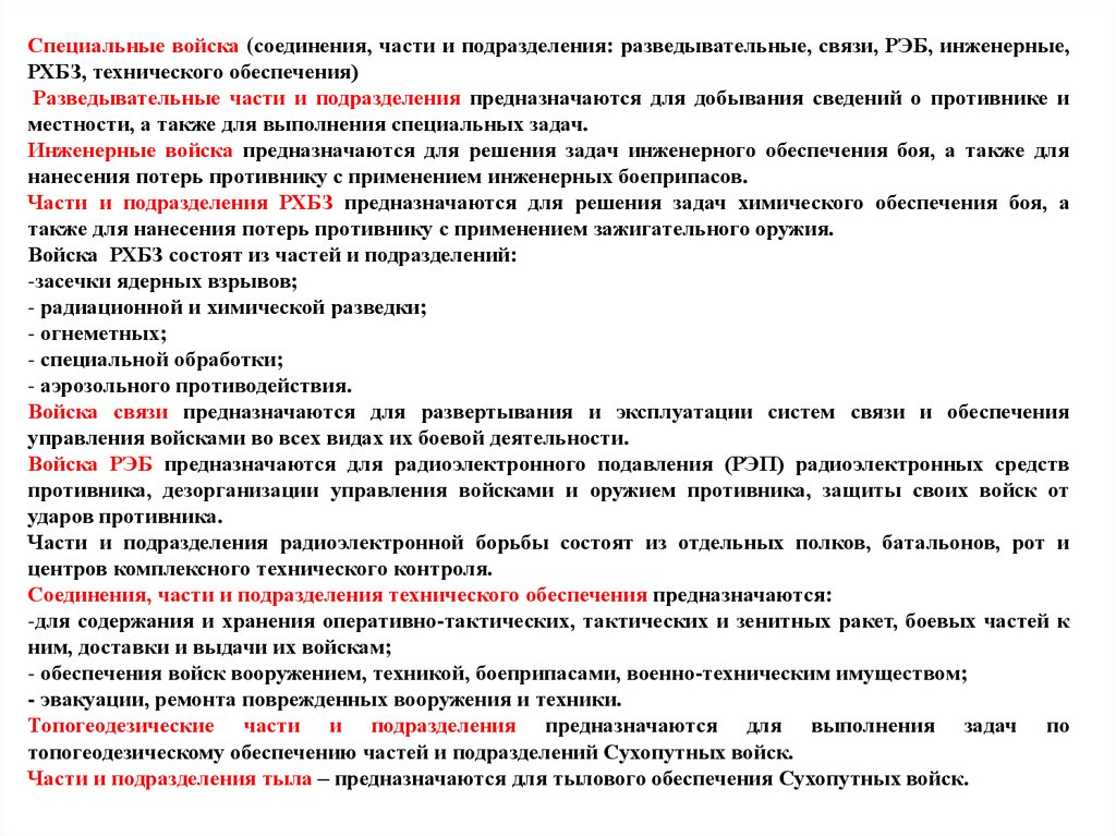 Специальные войска (соединения, части и подразделения: разведывательные, связи, РЭБ, инженерные,РХБЗ, технического обеспечения)