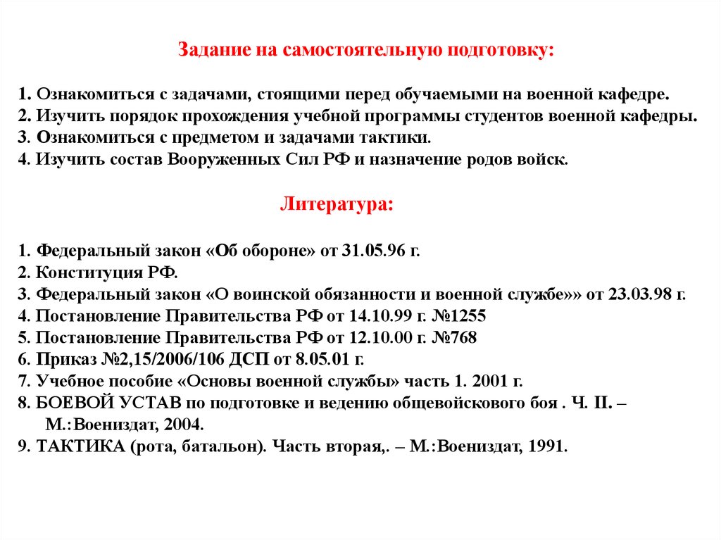 Задание на самостоятельную подготовку:1. Ознакомиться с задачами, стоящими перед обучаемыми на военной кафедре.