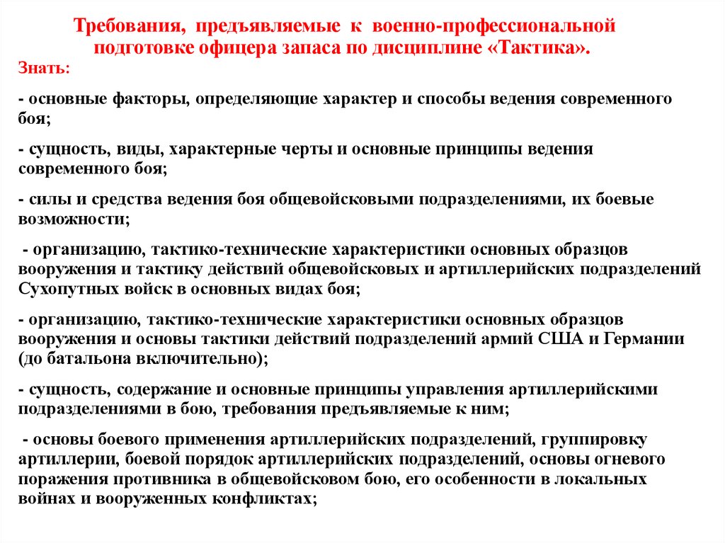 5. Требования, предъявляемые к военно-профессиональной подготовке офицера запаса по дисциплине «Тактика». Иметь представление: - о