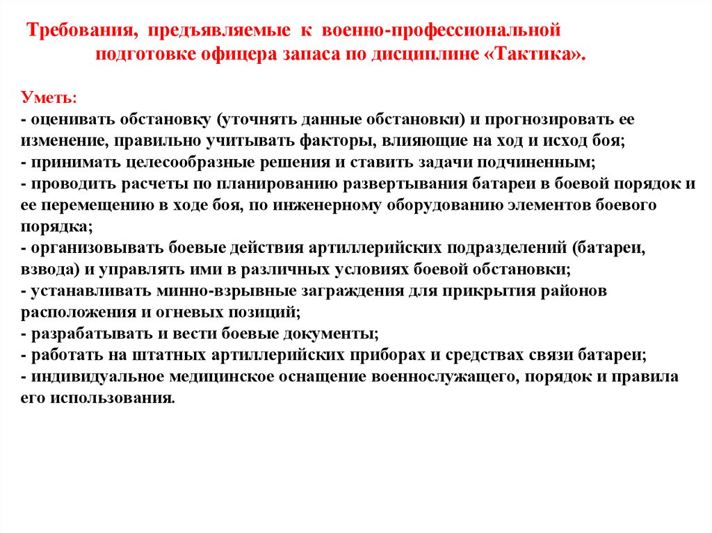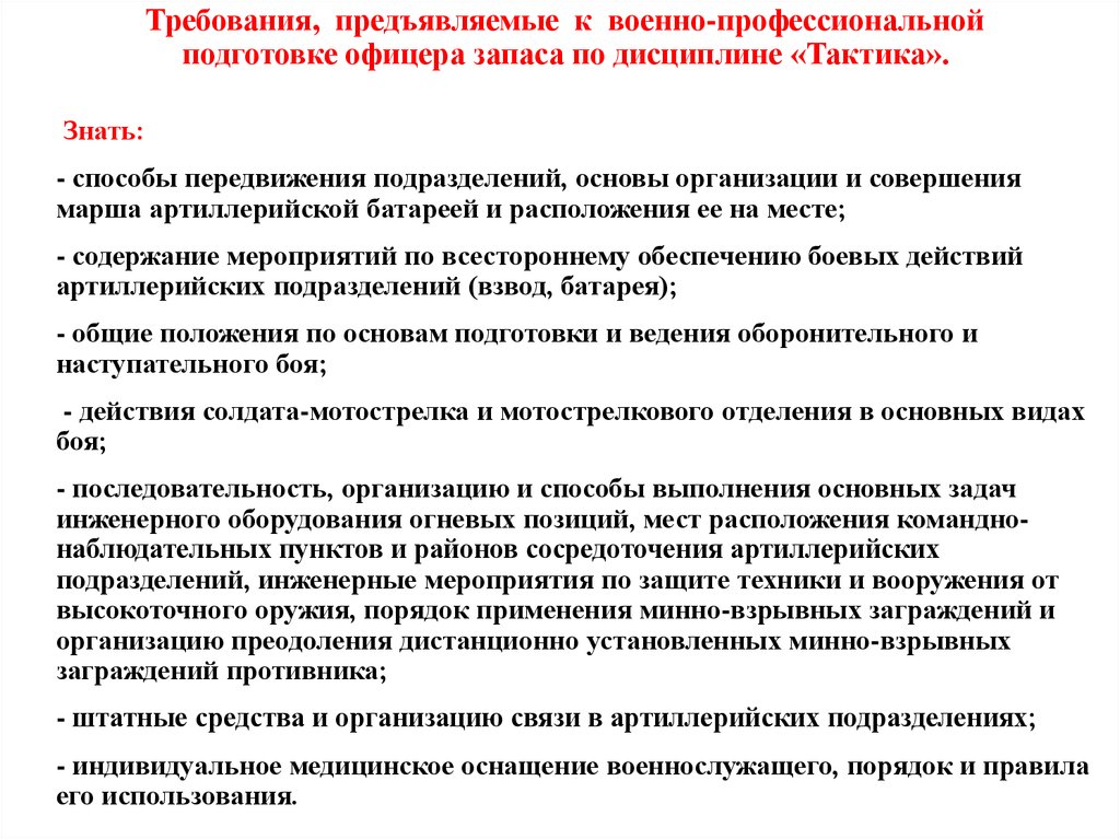 Требования, предъявляемые к военно-профессиональнойподготовке офицера запаса по дисциплине «Тактика».
