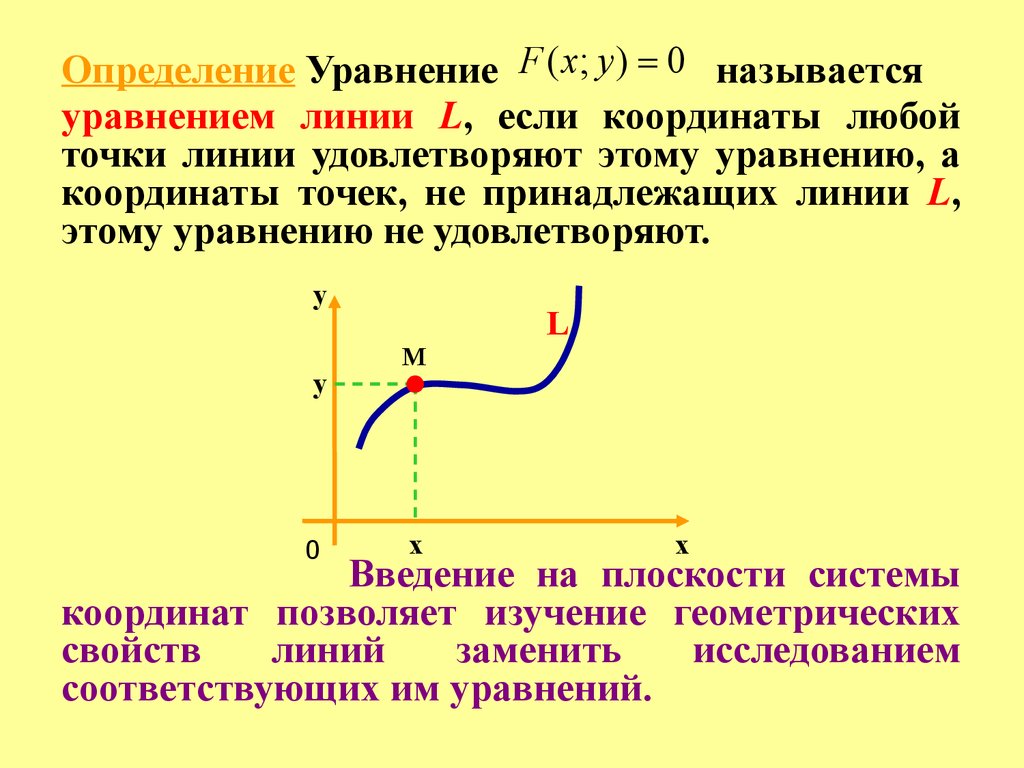 Определение Уравнение F ( x; y ) 0 называетсяуравнением линии L, если координаты любой