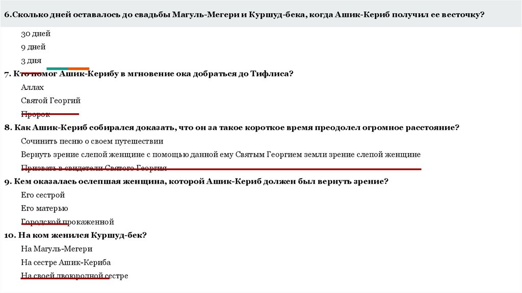 6.Сколько дней оставалось до свадьбы Магуль-Мегери и Куршуд-бека, когда Ашик-Кериб получил ее весточку?30 дней
