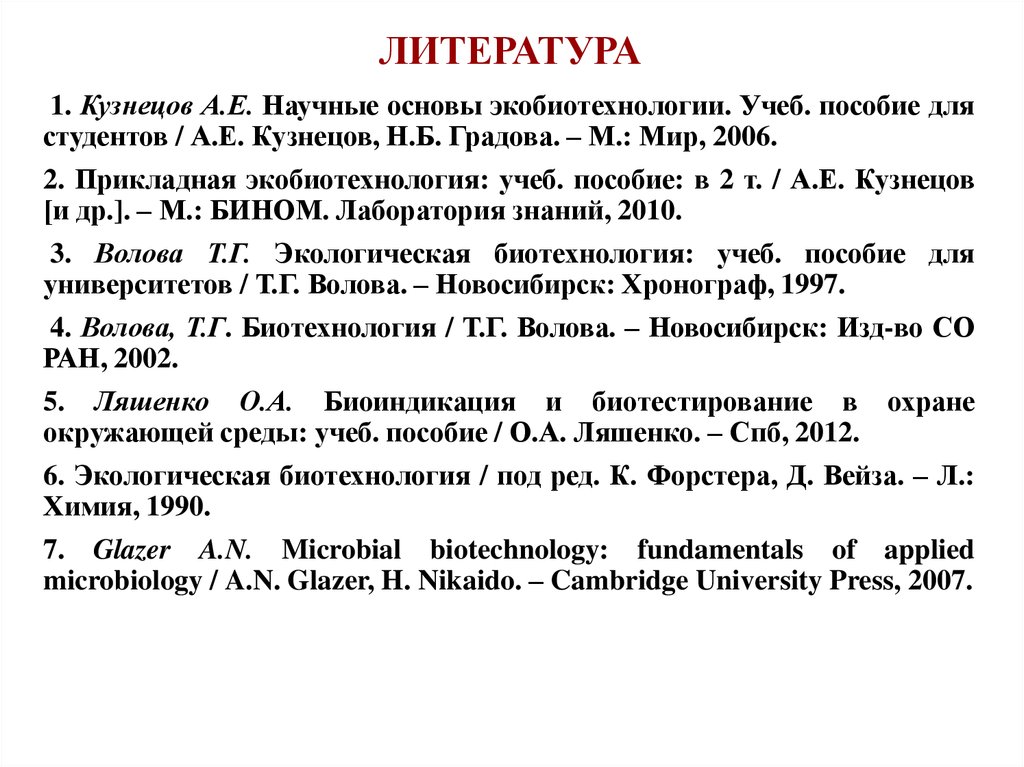 ЛИТЕРАТУРА1. Кузнецов А.Е. Научные основы экобиотехнологии. Учеб. пособие для