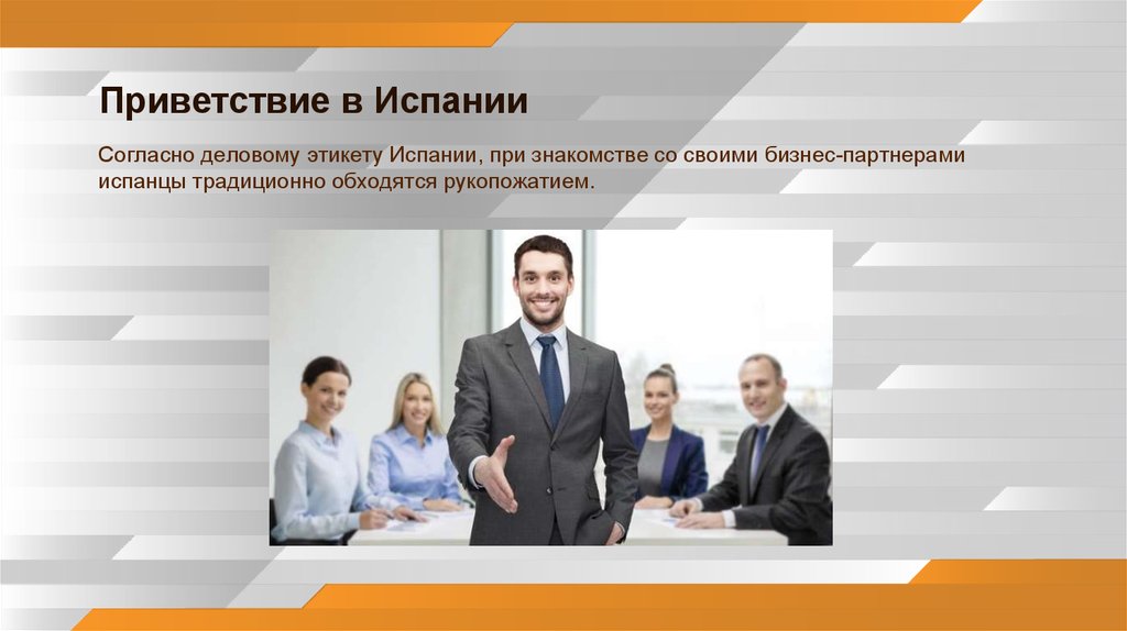 Приветствие в ИспанииСогласно деловому этикету Испании, при знакомстве со своими бизнес-партнерами