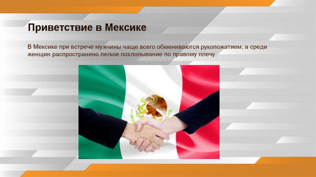 Приветствие в МексикеВ Мексике при встрече мужчины чаще всего обмениваются рукопожатием, а среди