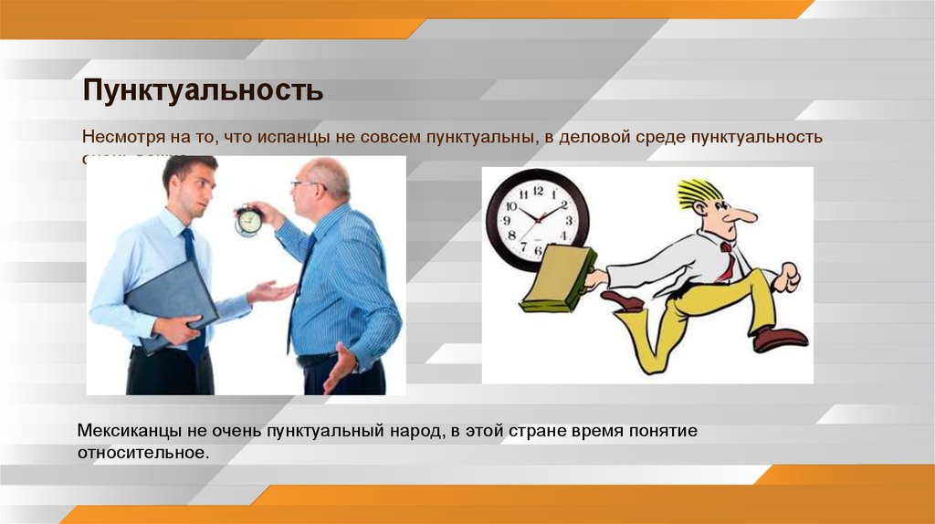 ПунктуальностьНесмотря на то, что испанцы не совсем пунктуальны, в деловой среде пунктуальность