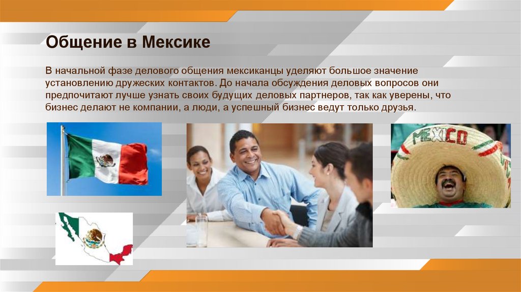 Общение в МексикеВ начальной фазе делового общения мексиканцы уделяют большое значение