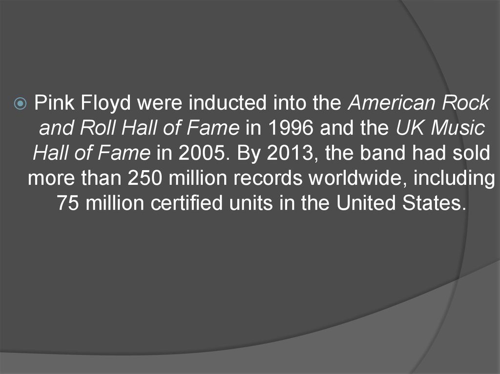 Pink Floyd were inducted into the American Rockand Roll Hall of Fame in 1996 and the UK Music