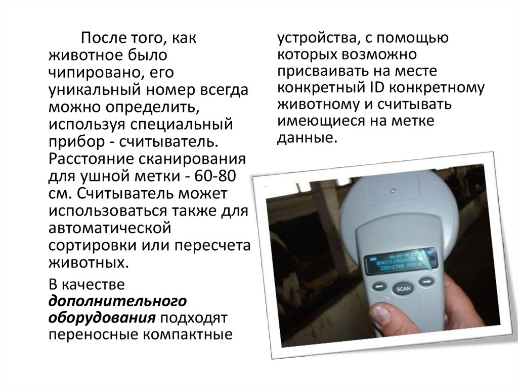 • Каждое животное чипируется, т.е.оснащается RFID-меткой. Метка содержит