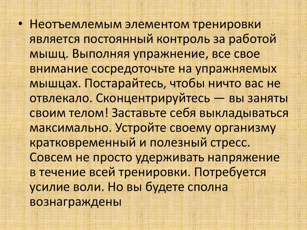 • Неотъемлемым элементом тренировкиявляется постоянный контроль за работой