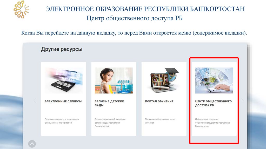 ЭЛЕКТРОННОЕ ОБРАЗОВАНИЕ РЕСПУБЛИКИ БАШКОРТОСТАННа портале http://edu.bashkortostan.ru/ в разделе «Другие ресурсы», располагается окно «Центр общественного