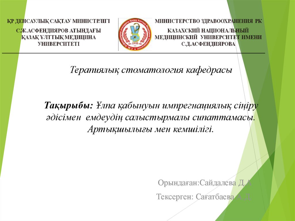 1. Терапиялық стоматология кафедрасы Тақырыбы: Ұлпа қабынуын импрегнациялық сіңіру әдісімен емдеудің салыстырмалы сипаттамасы.