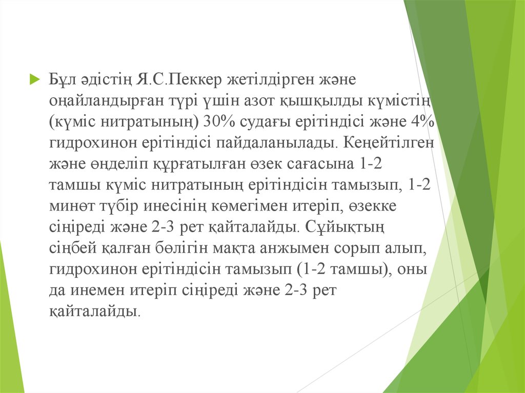 Бұл әдістің Я.С.Пеккер жетілдірген жәнеоңайландырған түрі үшін азот қышқылды күмістің