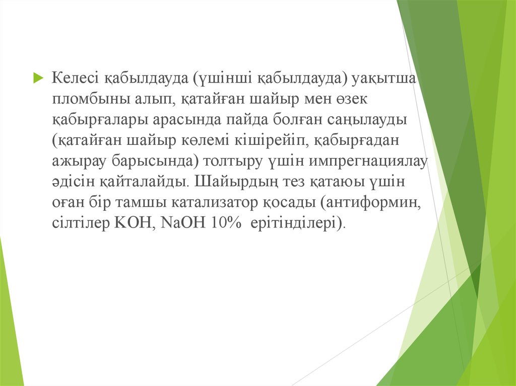 Келесі қабылдауда (үшінші қабылдауда) уақытшапломбыны алып, қатайған шайыр мен өзек