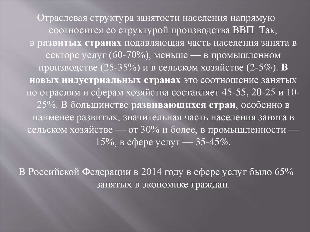Отраслевая структура занятости населения напрямуюсоотносится со структурой производства ВВП. Так,