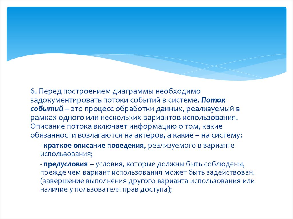 6. Перед построением диаграммы необходимозадокументировать потоки событий в системе. Поток