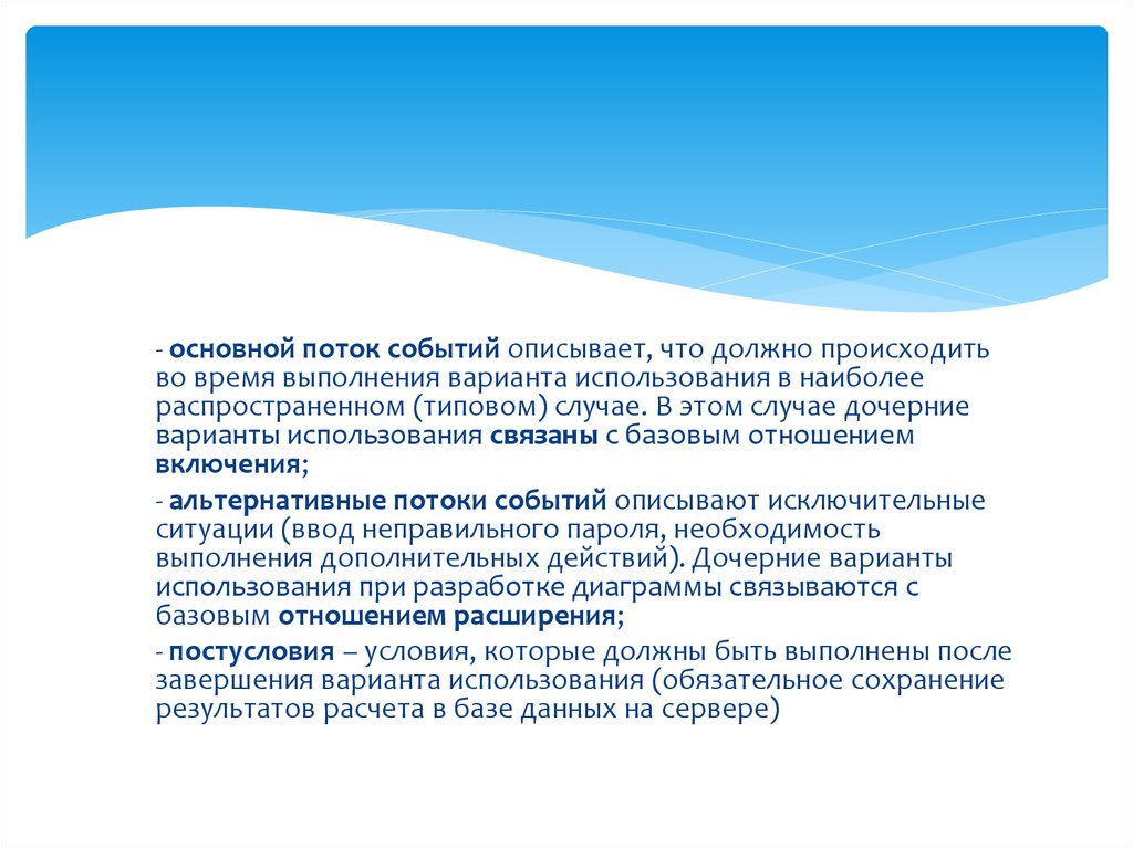 - основной поток событий описывает, что должно происходитьво время выполнения варианта использования в наиболее