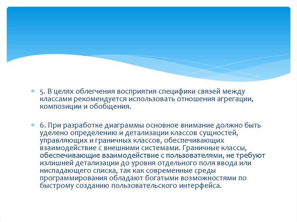 5. В целях облегчения восприятия специфики связей междуклассами рекомендуется использовать отношения агрегации,