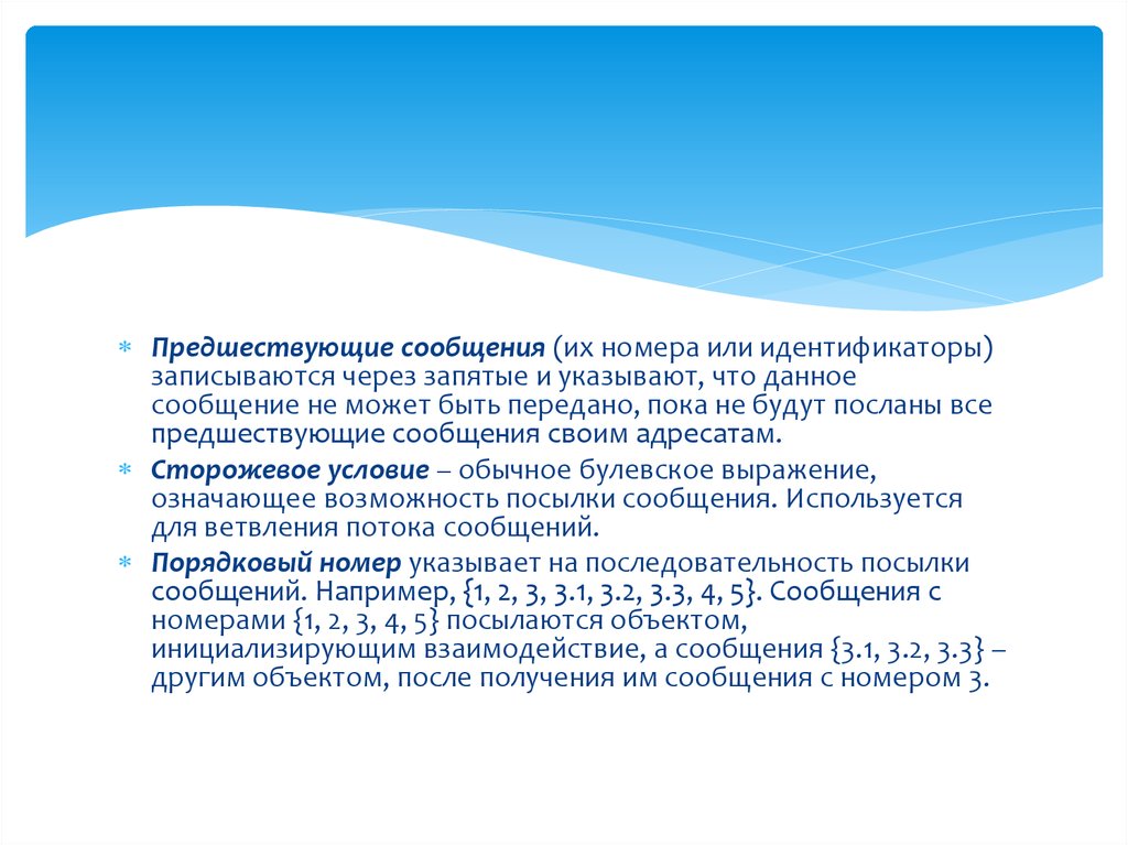 Предшествующие сообщения (их номера или идентификаторы)записываются через запятые и указывают, что данное