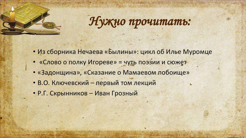 • Из сборника Нечаева «Былины»: цикл об Илье Муромце• «Слово о полку Игореве» = чуть поэзии и сюжет