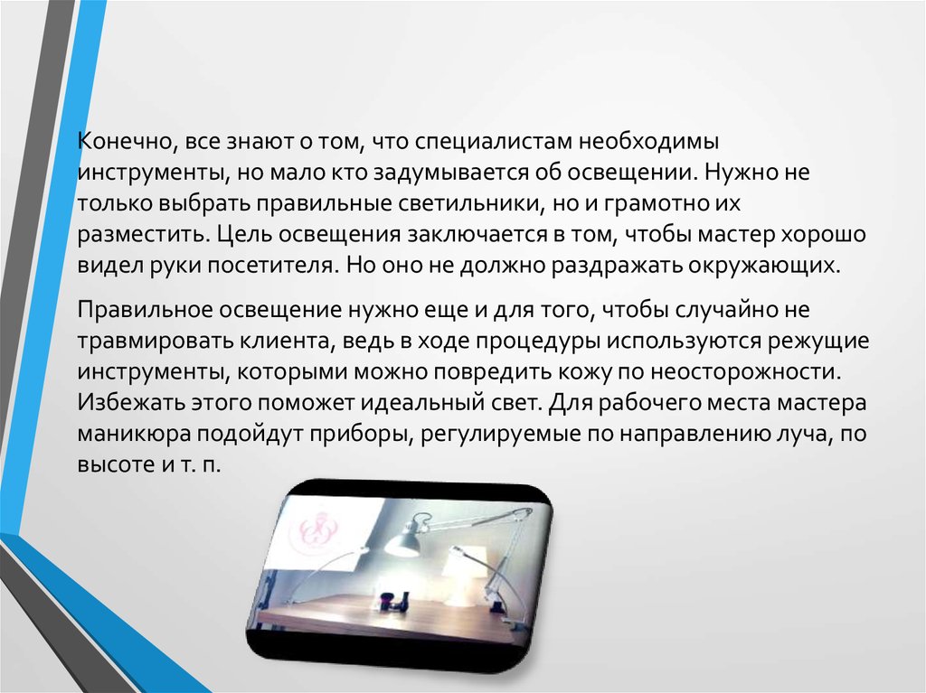 Конечно, все знают о том, что специалистам необходимыинструменты, но мало кто задумывается об освещении. Нужно не